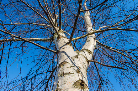 Birch tree tops view on blue sky