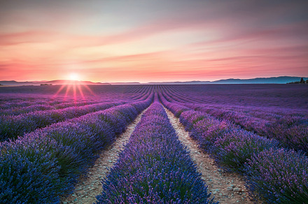 Lavender flower blooming fields containing lavender, lavande, and sunset