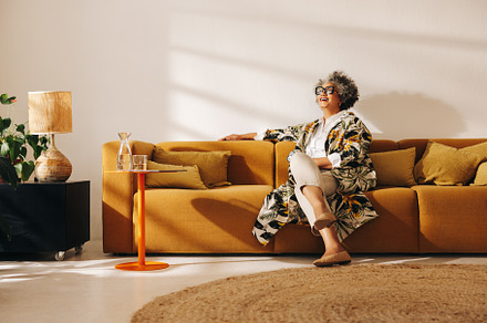 Mature businesswoman smiling happily in an office lobby – High-quality creative asset from Creative Market. Perfect for your design projects.